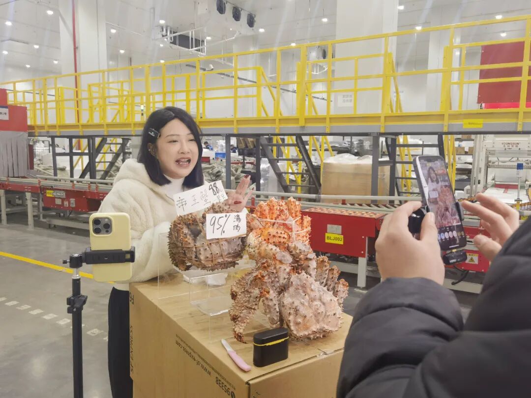 两位主播热情地与线上网友互动介绍手中的产品工人们正有条不紊地将酸奶、牛排等各式各样的货物装箱打包,送上自动化快递分拣线随后推送至相应物流出货口