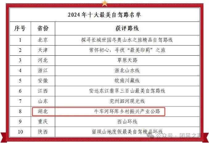 1月13日经过各省级交通运输主管部门审核推荐全媒体展示、实地复核、专家终评社会公示交通运输部公布了2024年十大最美自驾路名单其中团风县牛车河环库乡村振兴产业公路(以下简称牛车河环库路)荣誉入选是湖北省唯一获此殊荣的自驾游线路