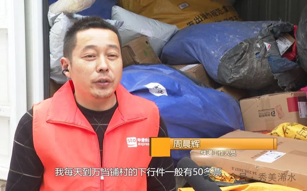 快递工作人员 周晨辉:我每天到万当铺村的下行件一般有50多票,寄出的有100多票,大部分寄出都是农产品。