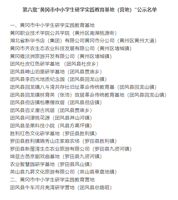 近日,经过专家和考评小组实地考查、评议,黄冈市教育局和黄冈市文旅局拟命名黄冈职业技术学院公共学院等20个单位为第六批“黄冈市中小学生研学实践教育基地(营地)”,现予以公示。
