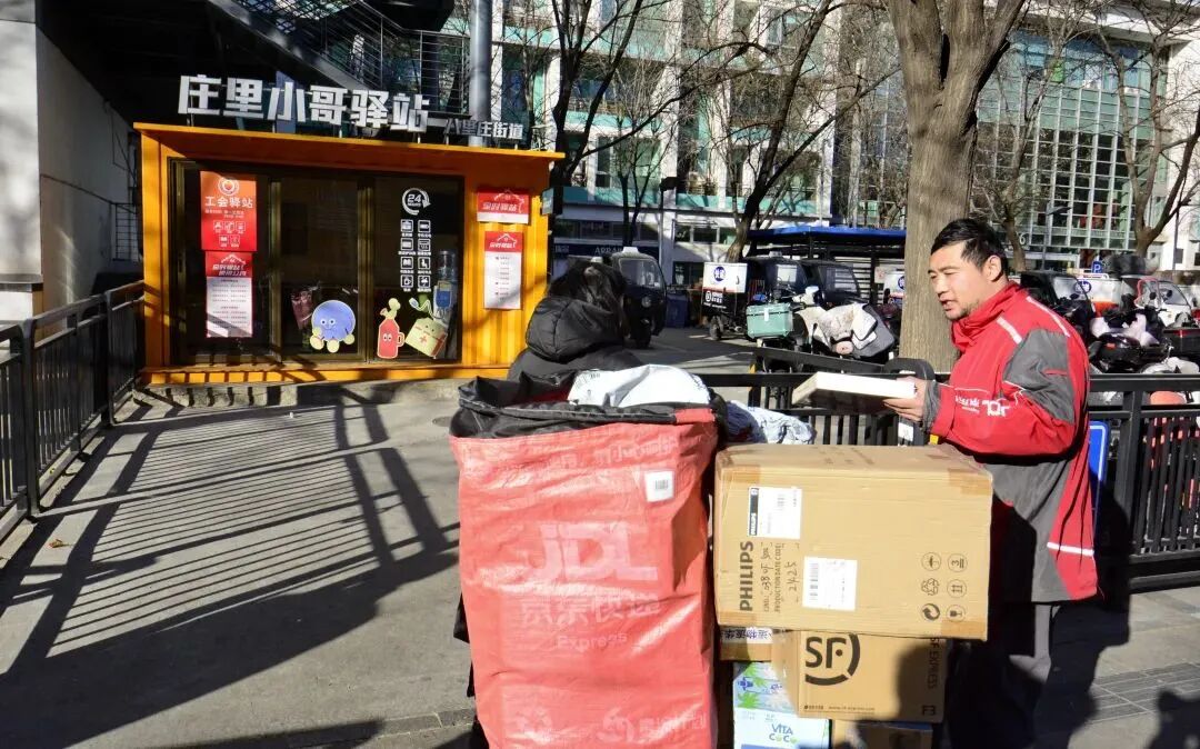 1月16日,在北京市朝阳区八里庄街道,一名快递员(右)准备前往“庄里小哥驿站”休息。李欣摄(新华社)