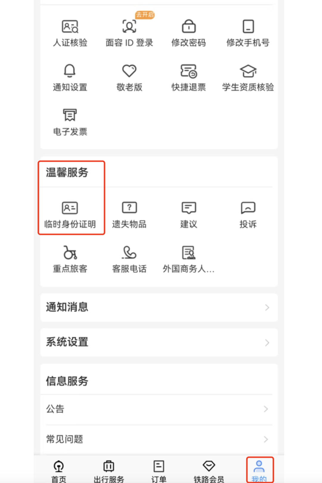 打开铁路12306App,点击“我的”,点击“温馨服务”中的临时身份证明;