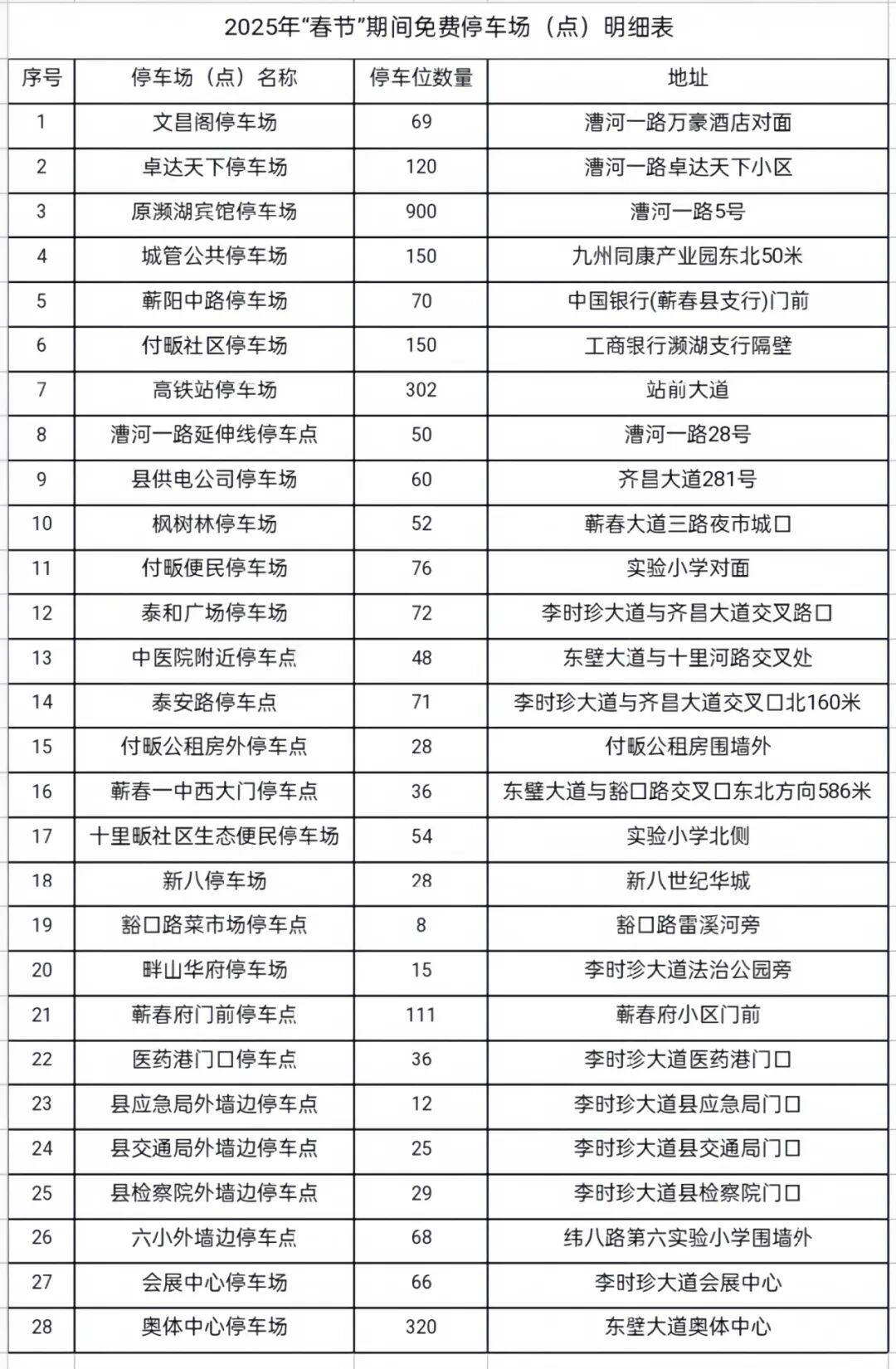 为缓解城区停车难问题方便广大群众停车 2025年春节假期 蕲春县漕河城区28处停车场(点) 4000多个泊位免费停车! 时间 2025年1月28日(除夕) 至2月4日(正月初七) 漕河城区免费停车场点位