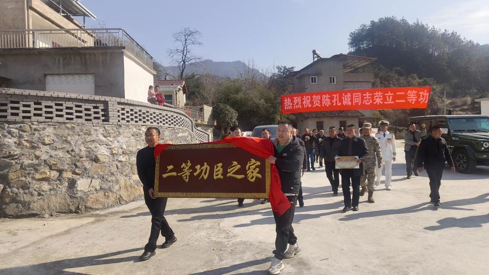 南部战区海军某部队联合麻城市人武部、市退役军人事务局、福田河镇政府,到该镇双庙关村为现役军人陈孔诚家庭送上“二等功臣之家”牌匾及奖励金,让军人军属共享尊崇荣光。