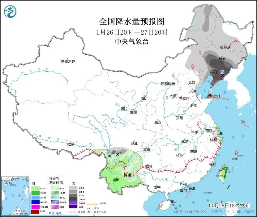 中央气象台预计,26日20时至27日20时,内蒙古东部、东北地区大部、山东半岛北部、四川南部、贵州西北部、云南东部等地部分地区有小到中雪或雨夹雪,其中,内蒙古东南部、辽宁中东部、吉林南部、山东半岛北部等地部分地区有大到暴雪,辽宁东南部局地有大暴雪。