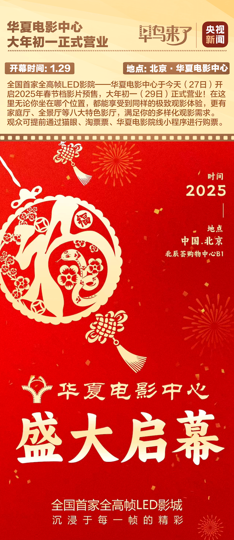 今天(27日),全国首家全高帧LED影院——华夏电影中心开启2025年春节档影片预售,大年初一(29日)盛大启幕!在这里无论你坐在哪个位置,都能享受到同样的极致观影体验,更有家庭厅、全景厅等八大特色影厅,满足你的多样化观影需求。