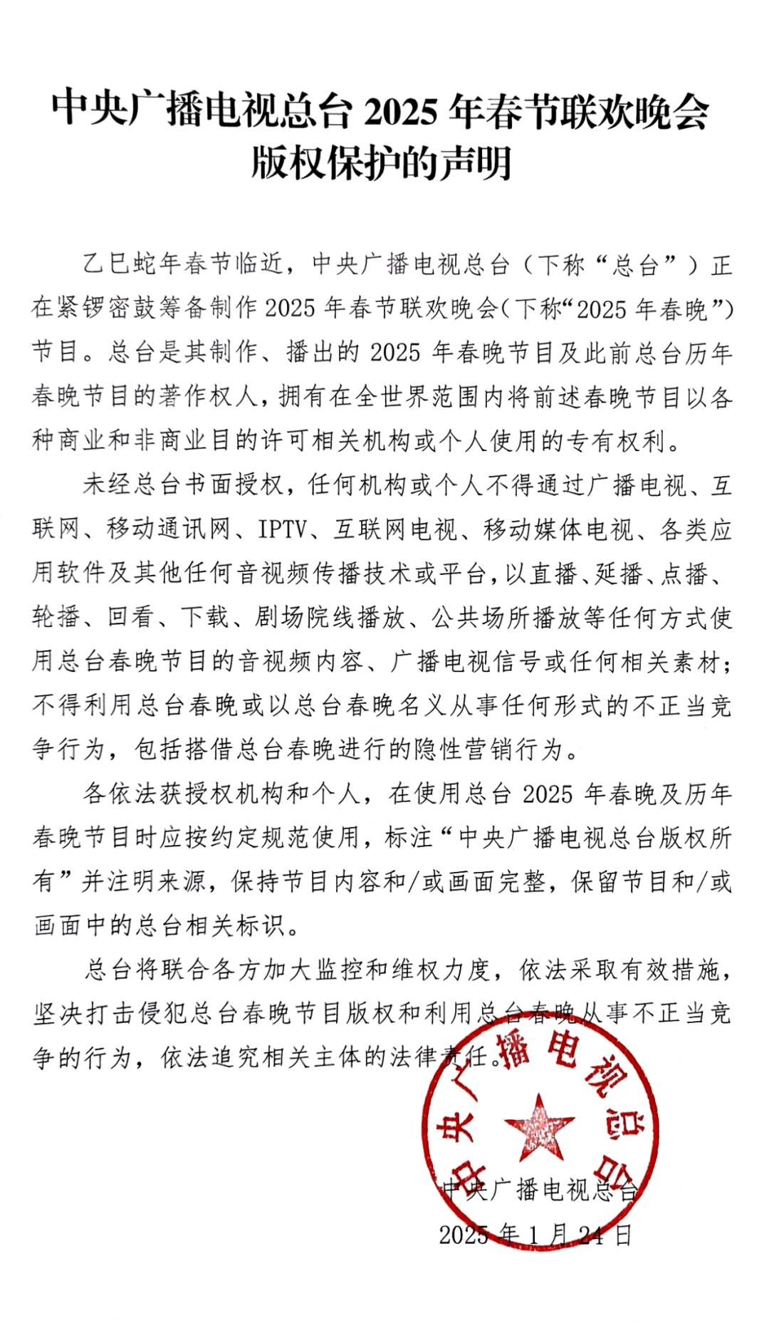 日前,中央广播电视总台发布2025年春节联欢晚会版权声明。