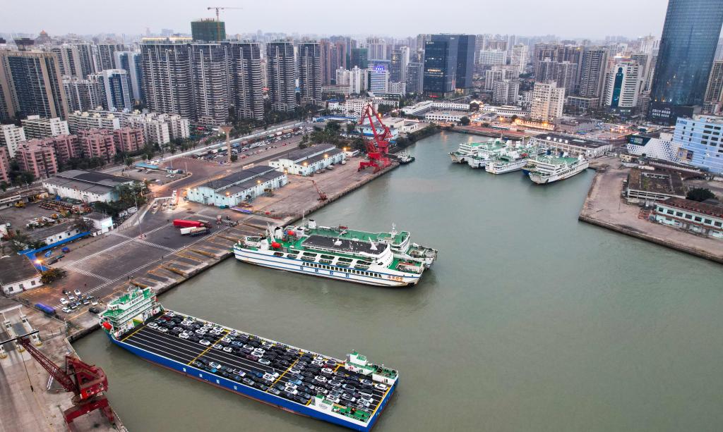 春节临近,琼州海峡迎来过海客流高峰(无人机照片)。新华社记者 杨冠宇 摄