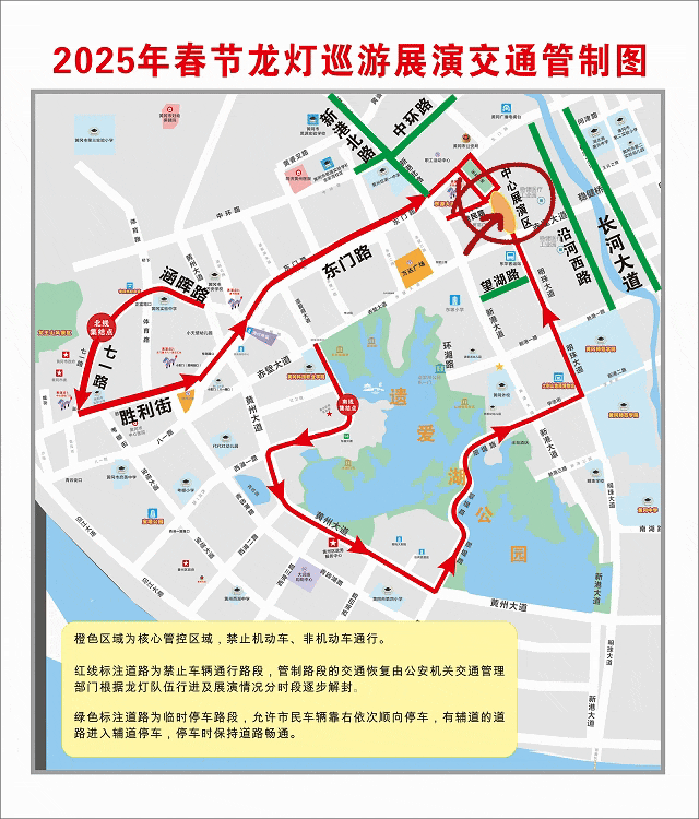 以上红线标注道路为禁止车辆通行路段,管制路段的交通恢复由公安机关交通管理部门根据龙灯队伍行进及展演情况分时段逐步解封。