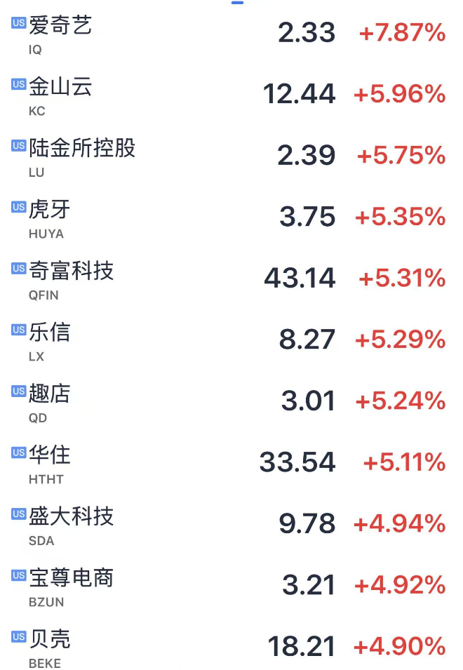 热门中概股方面,嘉楠科技涨近20%,盛美半导体涨超17%,金山云涨逾13%,爱奇艺涨超7%,老虎证券涨逾7%,新濠博亚娱乐涨超6%,阿里巴巴涨超6%,百度集团涨逾5%。