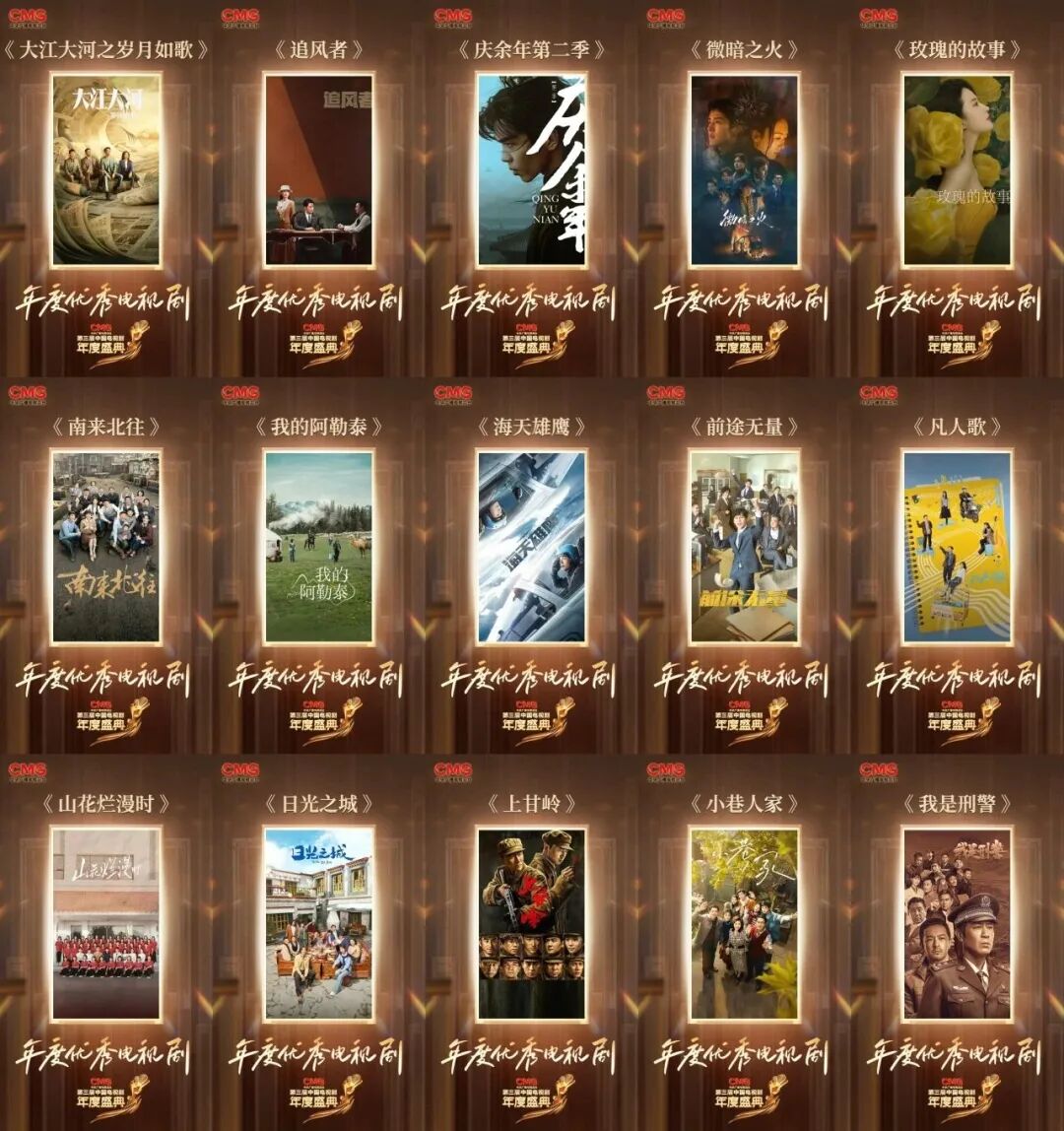 《大江大河之岁月如歌》《追风者》《庆余年第二季》《微暗之火》《玫瑰的故事》《南来北往》《我的阿勒泰》《海天雄鹰》《前途无量》《凡人歌》《山花烂漫时》《日光之城》《上甘岭》《小巷人家》《我是刑警》15部精品力作获得了“年度优秀电视剧”荣誉。