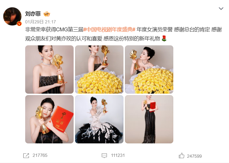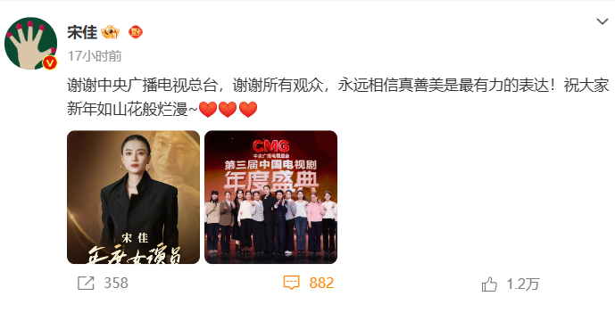当晚,刘亦菲、宋佳分别在社交媒体发文感谢,收获诸多网友祝福!