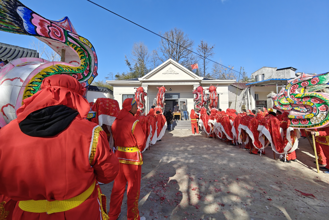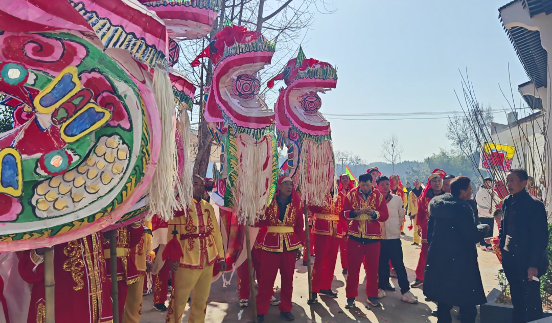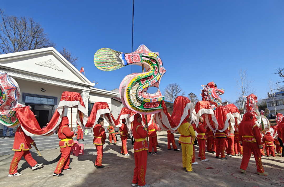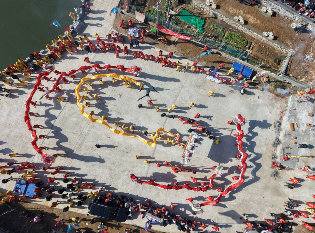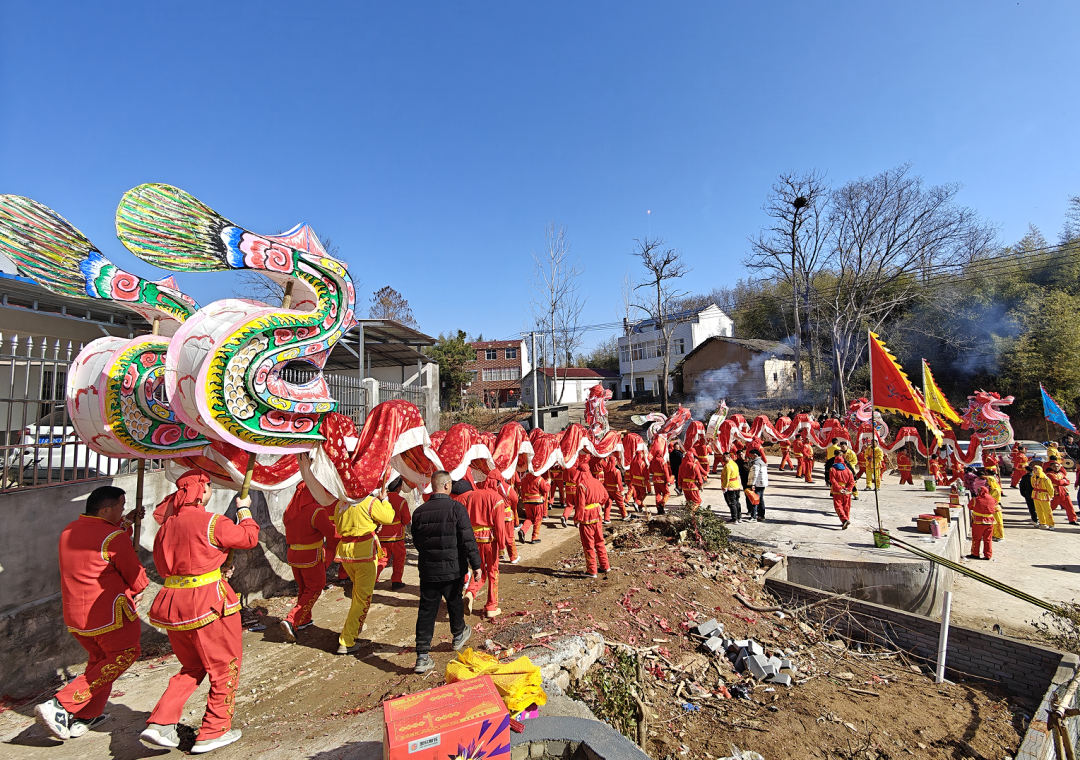 表演者们身着统一服装手持舞龙杆伴随着铿锵有力的锣鼓声一条条色彩斑斓的巨龙翻腾跳跃吸引了村民驻足观看大家纷纷拿出手机拍摄下这欢乐的场景