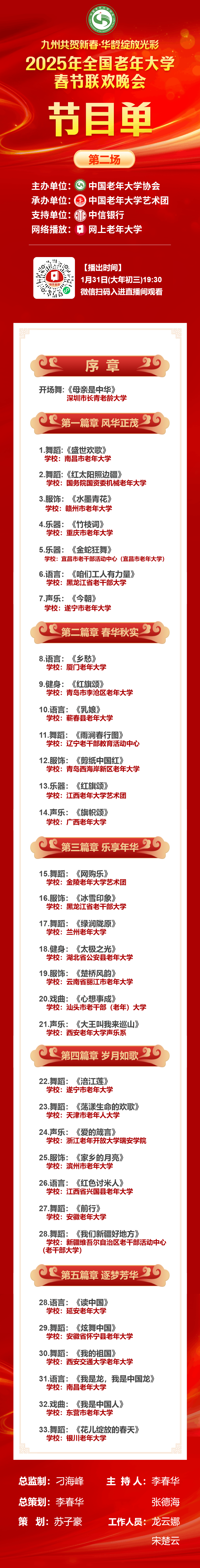 2025年全国老年大学春节联欢晚会节目单(第二场)