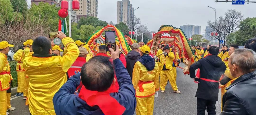 一条条龙灯在人群中蜿蜒舞动,引得围观群众连连喝彩。整个城市沉浸在欢乐祥和的氛围中。外国友人也前来凑热闹,感受着黄冈的春节氛围。