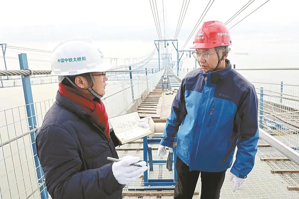 在猫道上,测量负责人夏焕文手持智能测量尺,对首根过江的索股进行形变监测。在猫道建设完成后,1月7日,长3000米、重71吨的首根索股成功架设。从那时至今,他和工友一直在对索股的受力、形变等情况进行监测,并适时进行调整。他介绍,大桥的4条主缆,每条都由217根这样的索股合成,每条重达15000吨。“首根索股是主缆的基准索,基准索准到位了,后续索股的架设才能顺利跟进。”