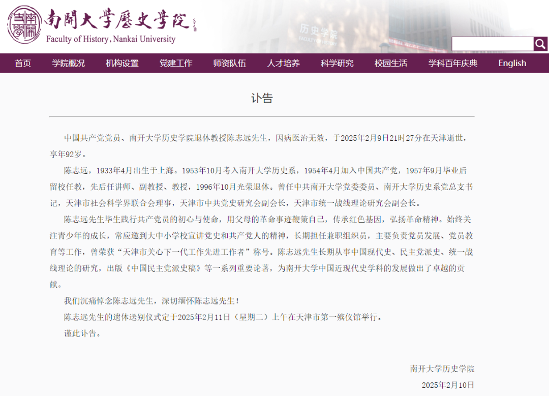 2月10日,南开大学历史学院发布讣告。