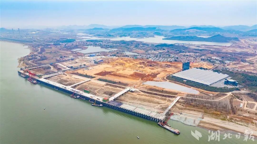 俯瞰建设中的武穴港区铁水联运项目综合码头。(湖北日报全媒记者 柯皓 摄)