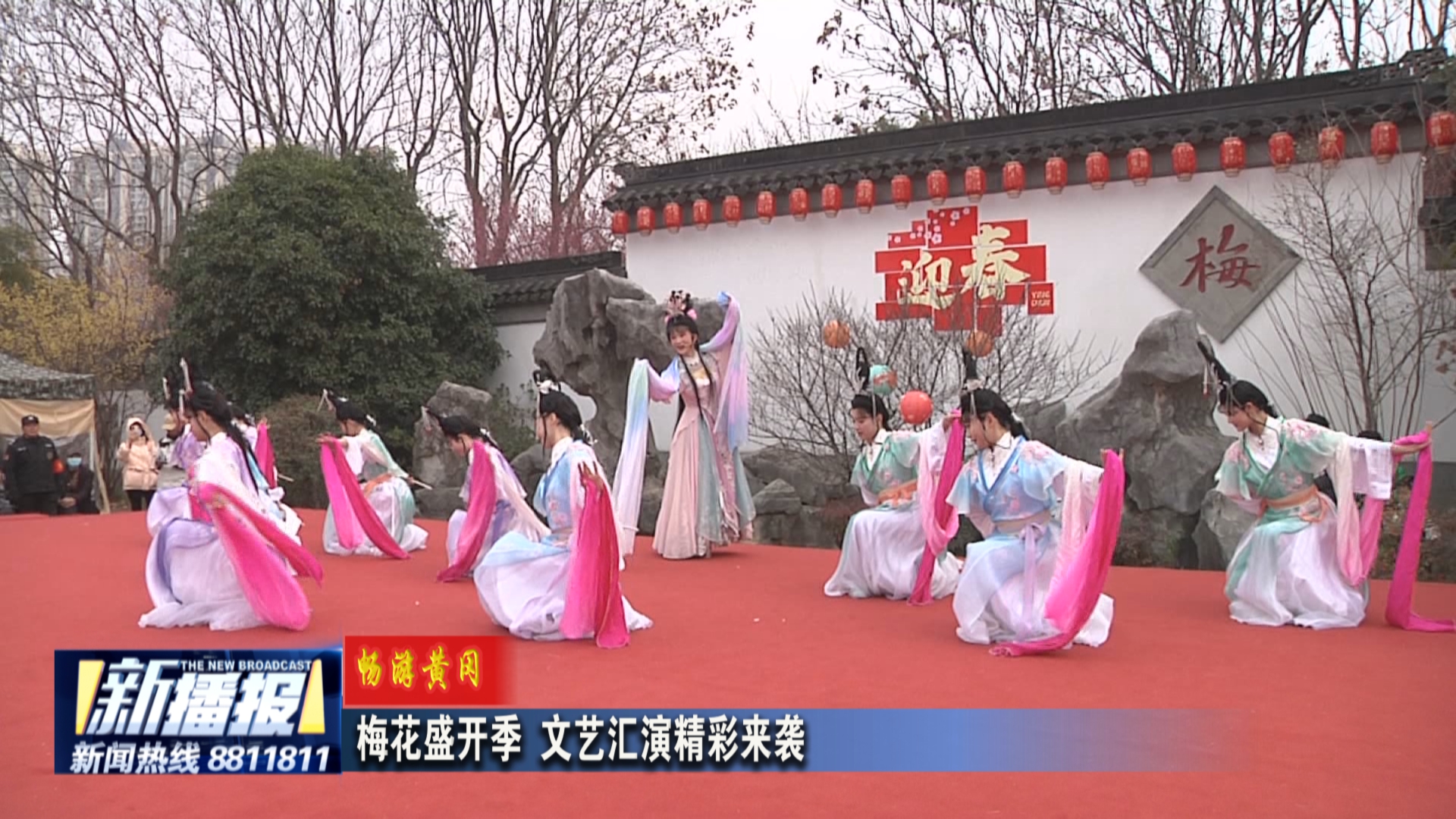 2月12日,遗爱湖红梅傲雪景区热闹非凡,各种文艺节目在梅园轮番上演,闹元宵、赏花灯节日氛围满满。图为国风花灯巡游吸引大批游客观看。