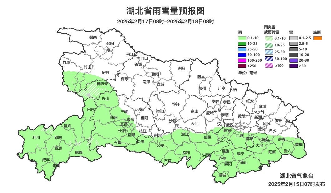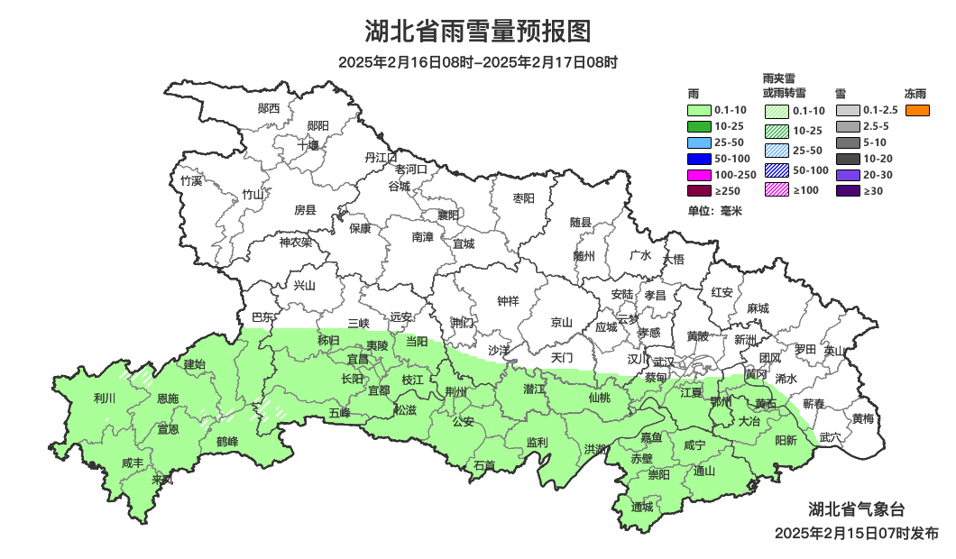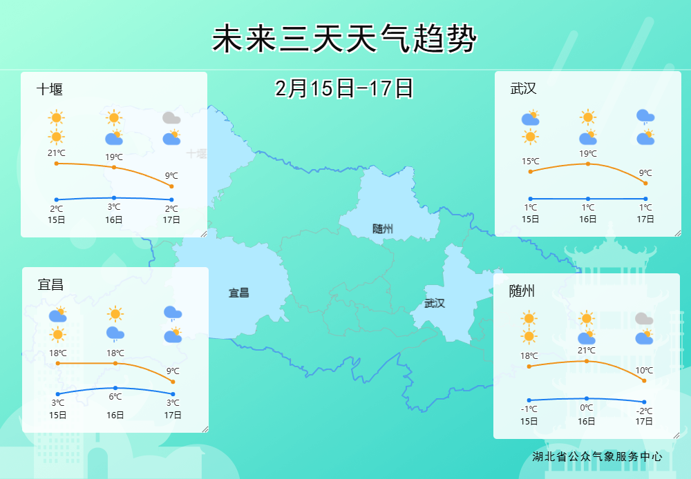 2月15日08时-16日08时,鄂东南南部零星小雨转多云;其他地区多云转晴天。最高气温中西部15~20℃、东部10~15℃,最低气温鄂西北-2~1℃、其他地区1~5℃,偏南风2到3级。
