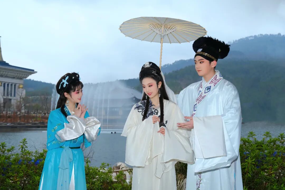 “姐姐,我们可真是来对地方了!你看,这游湖的男男女女都是成双结对,真有意思!”微波荡漾的明镜湖中,“小青”的一句呼唤,将游客拉入《白蛇传》情节中。衣袂飘飞的“白素贞”在画舫中上演与“许仙”初遇、借伞的浪漫桥段,湖边栈桥上的游客既是观众,也成了“群演”,瞬间沉浸到典雅悠扬的戏曲声中。