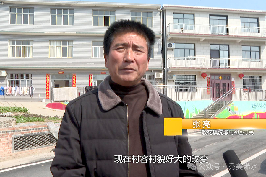 散花镇沈墩村4组村民 张亮:以前出门一身灰,道路坑坑洼洼的,现在村容村貌有了好大的改变。