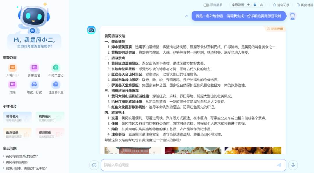 在旅游服务方面,平台基于全域旅游数据,为游客提供个性化、智能化的旅游服务,游客通过手机、平板等移动终端即可获取个性化旅游攻略、行程规划,让黄冈之旅更加顺畅愉快。