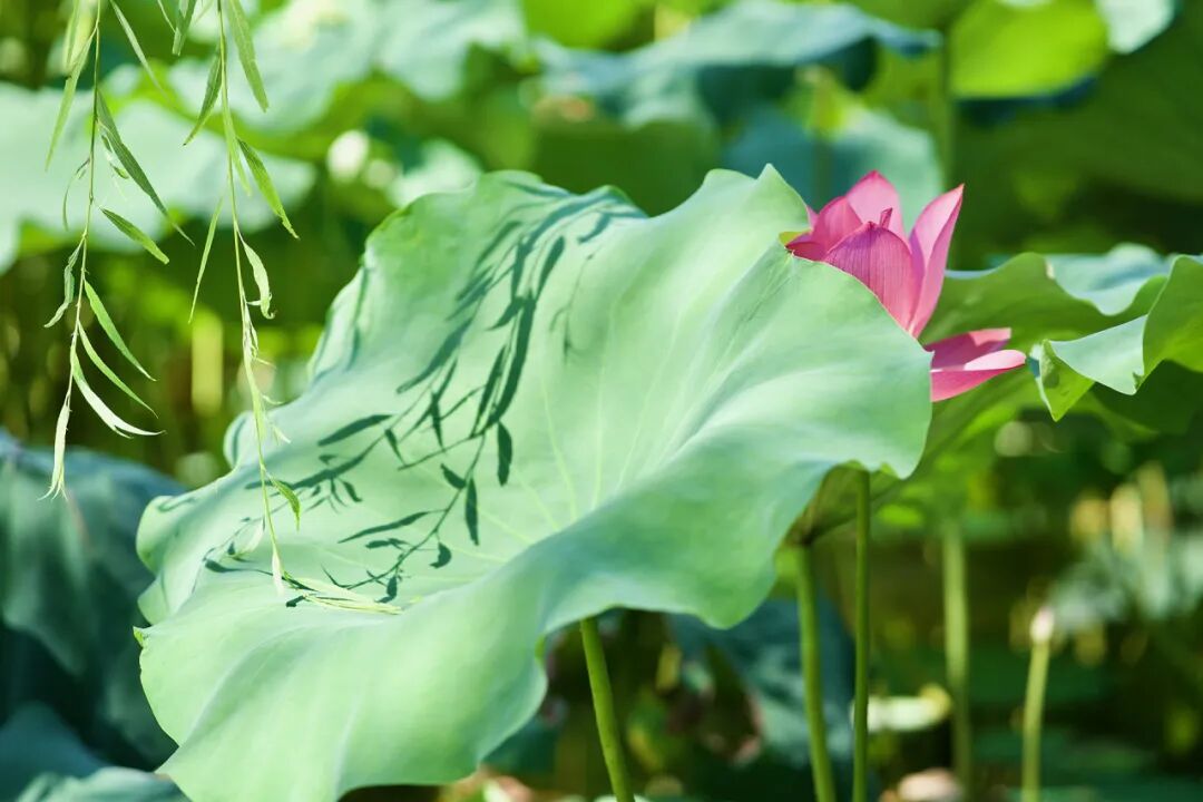 微风过处,送来缕缕清香,仿佛远处高楼上渺茫的歌声似的。这时候叶子与花也有一丝的颤动,像闪电般,霎时传过荷塘的那边去了。叶子本是肩并肩密密地挨着,这便宛然有了一道凝碧的波痕。叶子底下是脉脉的流水,遮住了,不能见一些颜色;而叶子却更见风致了。