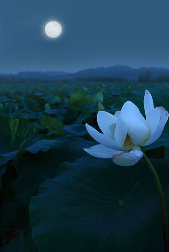 月光如流水一般,静静地泻在这一片叶子和花上。薄薄的青雾浮起在荷塘里。叶子和花仿佛在牛乳中洗过一样;又像笼着轻纱的梦。虽然是满月,天上却有一层淡淡的云,所以不能朗照;但我以为这恰是到了好处——酣眠固不可少,小睡也别有风味的。月光是隔了树照过来的,高处丛生的灌木,落下参差的斑驳的黑影,峭楞楞如鬼一般;弯弯的杨柳的稀疏的倩影,却又像是画在荷叶上。塘中的月色并不均匀;但光与影有着和谐的旋律,如梵婀玲上奏着的名曲。