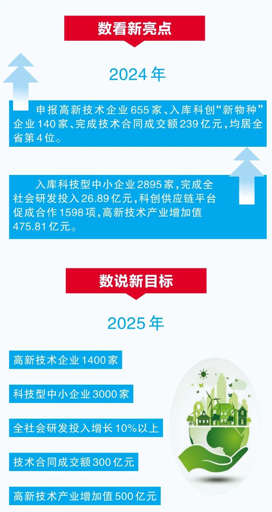 答:2025年,全市科技系统将深入实施科技创新“1155”行动计划(即“聚焦一个定位、紧扣一条主线、实施五大行动、建设五大功能区”)。聚焦建设全省科技创新协同区定位,紧扣科技创新与产业创新深度融合主线,实施创新体系提升、创新主体提质、创新产业提效、创新平台提能、创新生态提优“五大行动”,着力打造全省融圈入廊先行区、产业协同承载区、成果转化试验区、创新人才聚集区、创新生态示范区。力争今年全市高新技术企业达到1400家,科技型中小企业达到3000家,全社会研发投入增长10%以上,技术合同成交额达到300亿元,高新技术产业增加值达到500亿元。