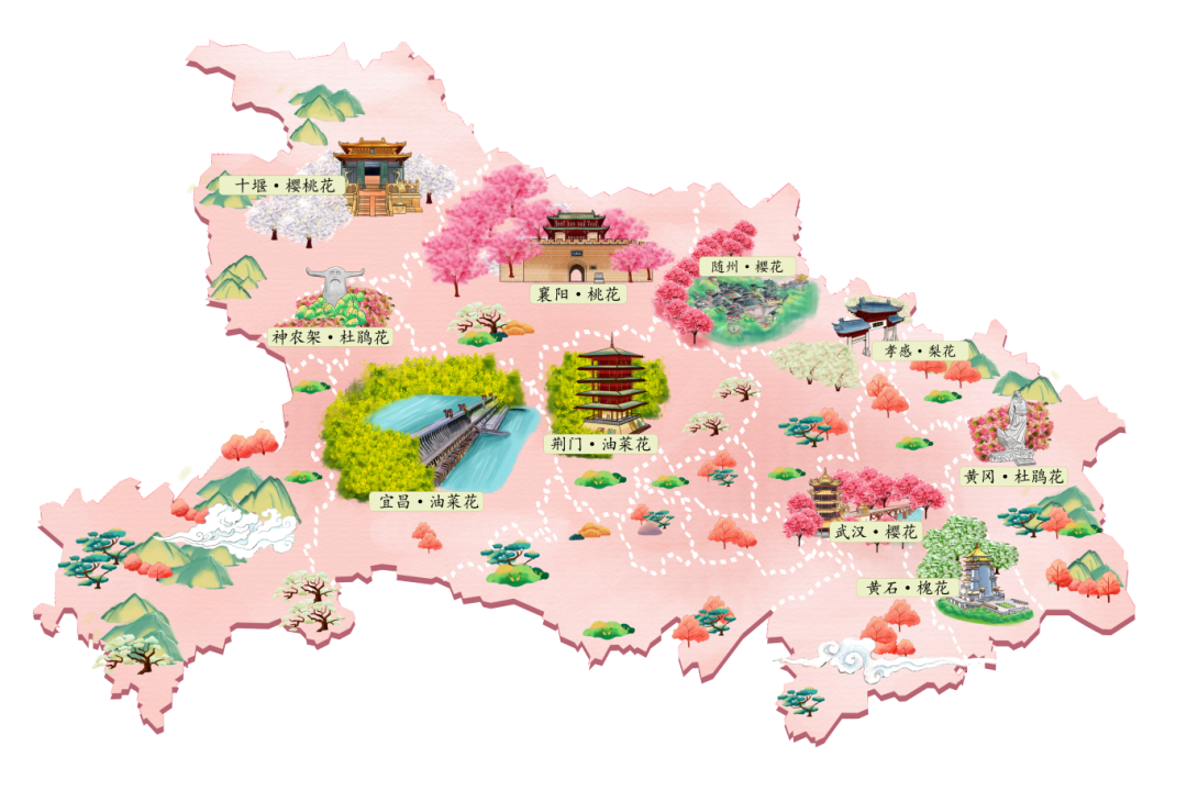 行程路线:黄州叶路洲(踏青、赏花、休闲垂钓、采摘)——团风田园童话世界(郁金香、樱花、梨花)、总路咀镇2号旅游公路沿线的油菜花海、贾庙乡桃花基地——浠水巴河城油菜花海——武穴大法寺油菜花海(赏满目金黄 看花海与山林、溪水、农舍相依 感受纯粹乡野风情)