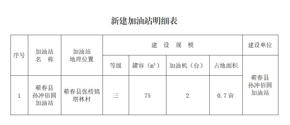 根据黄冈市加油站行业发展规划,经相关程序审核研究通过,蕲春将符合条件的拟新建加油站予以公示,公示期自2025年3月3日至2025年3月9日,建设地点(地段)及建站规模如下: