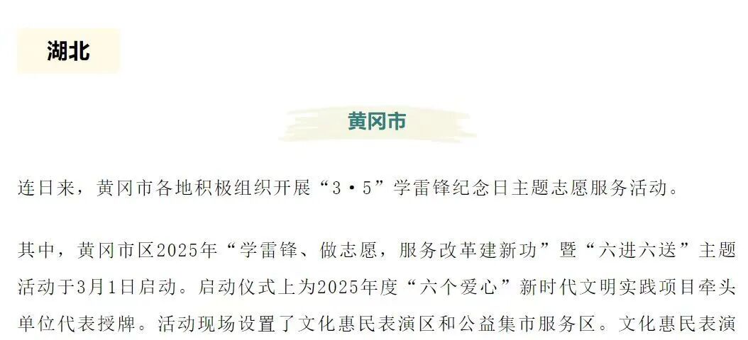 连日来,黄冈市各地积极组织开展“3·5”学雷锋纪念日主题志愿服务活动。