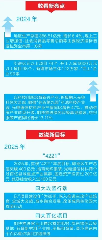 在区域联动中建强桥头堡。向西融入武汉都市圈,依托“光谷第九园”小池科技产业园,推进东湖高新区光电通信材料项目转化;向东链接合肥都市圈和长三角,建设绿色印染专业园区,承接绿色印染和现代纺织产业转移;向南深化跨省跨江合作,推进临港物流、现代农业区域一体化发展。