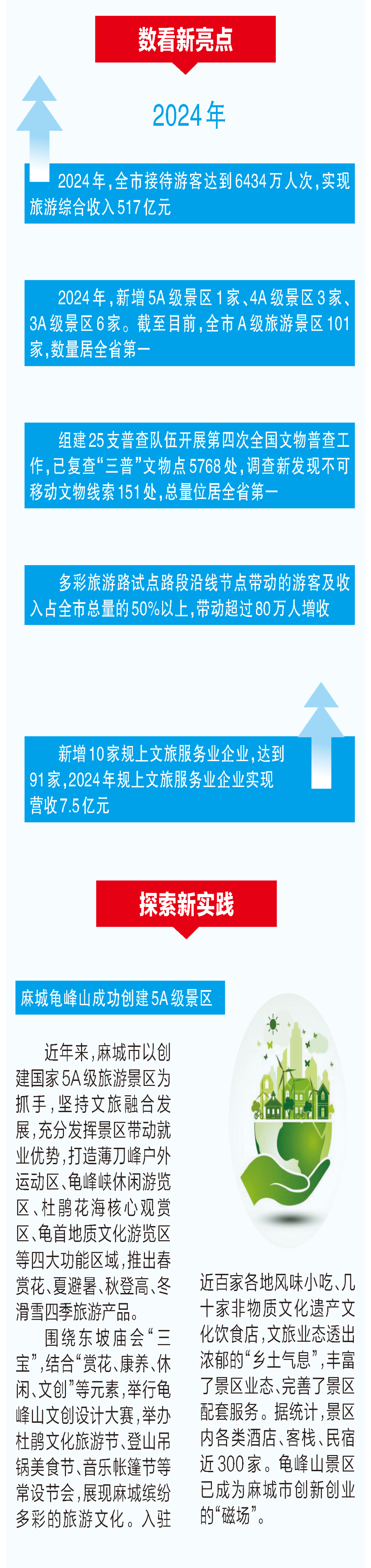 品牌创建取得重大突破。推动麻城龟峰山5A级景区创建提质升级,实现鄂东地区5A“零”的突破。红安锦绣铜锣、英山毕昇纪念园、蕲春李时珍文旅区新晋4A级旅游景区,全市A级旅游景区数量增至101家,数量占全省第一。