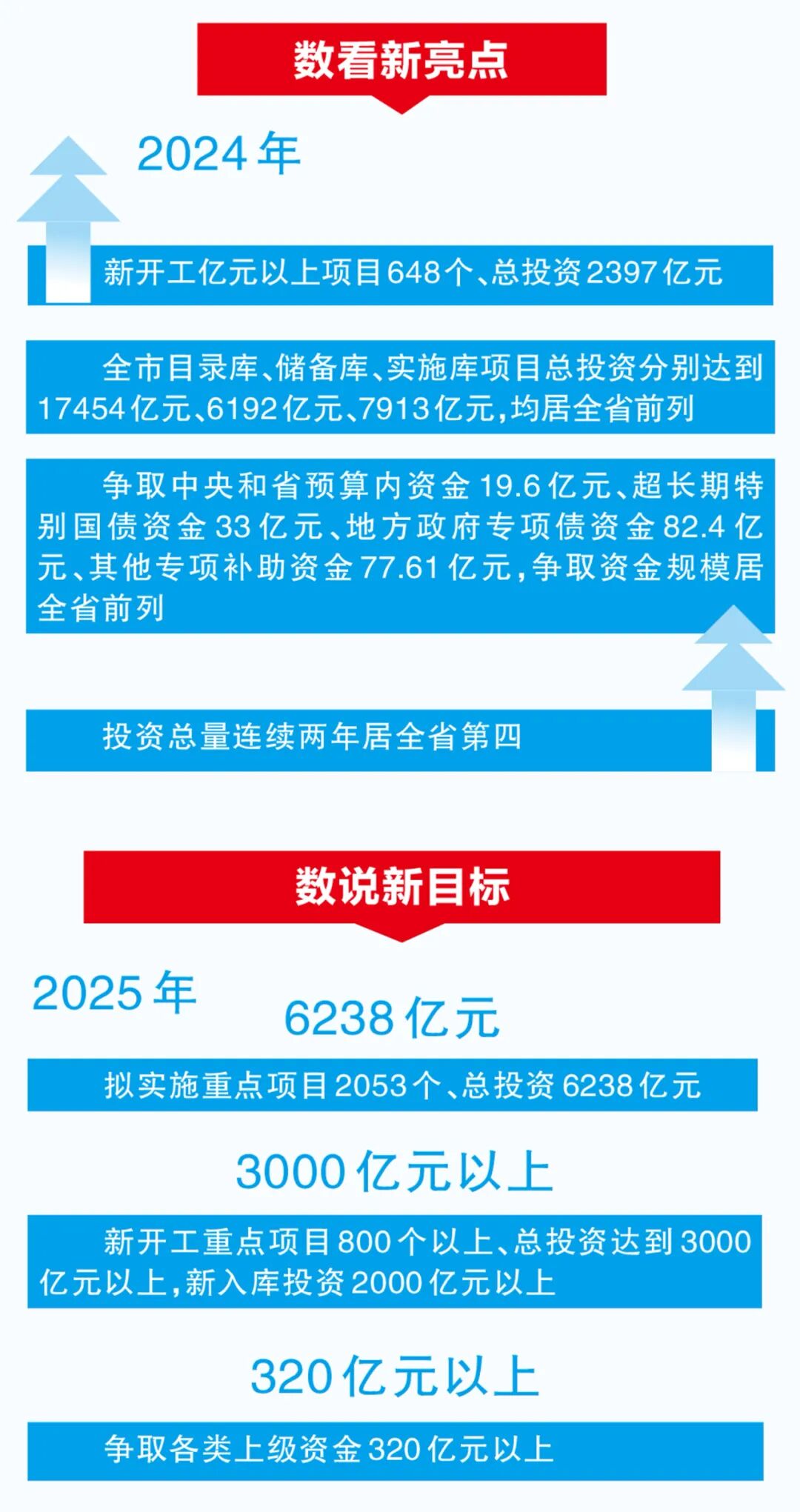 项目储备充足。全市目录库、储备库、实施库项目总投资分别达到17454亿元、6192亿元、7913亿元,均居全省前列。其中,2025年拟实施重点项目2053个、总投资6238亿元,同比均大幅提升。