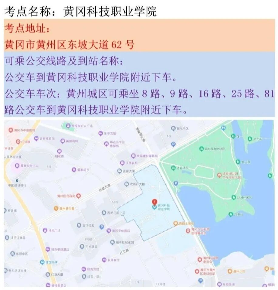 因黄冈考区参考人数较多,黄州城区住宿、交通等压力较大,为保障考生顺利参考,今年继续在黄冈市黄州城区和麻城市同时设立考点。黄州城区考点设在黄冈师范学院、黄冈职业技术学院、湖北黄冈应急管理职业技术学院、黄冈科技职业学院、黄冈思源实验学校等5所学校。麻城市考点设在麻城市职业技术教育集团、麻城市第一中学、麻城市第五初级中学(麻城市中心实验学校)等3所学校。