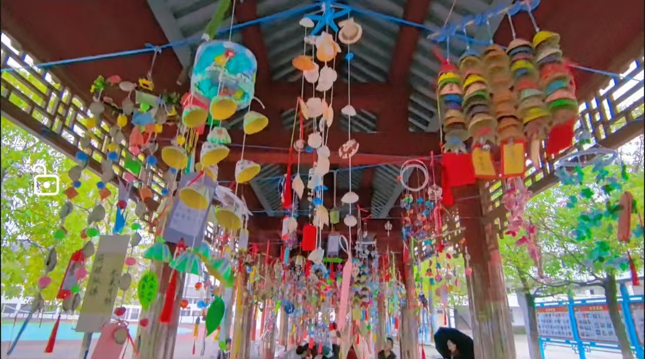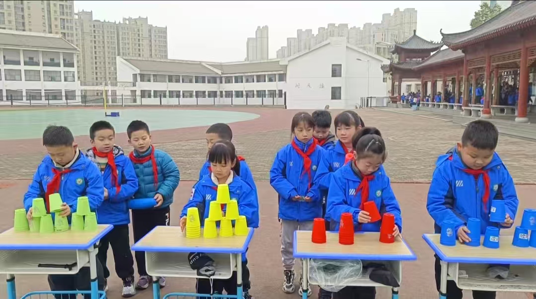 文化长廊上,几百个五彩风铃随风轻摆,每个风铃下都挂着一张趣味题卡,旁边的桌子上摆放好飞叠杯。学生们穿梭其间,时而凝神思考,时而欢呼雀跃,每答对一题或完成飞叠杯比赛,便能从老师手中领取一枚精致的π形钥匙扣。