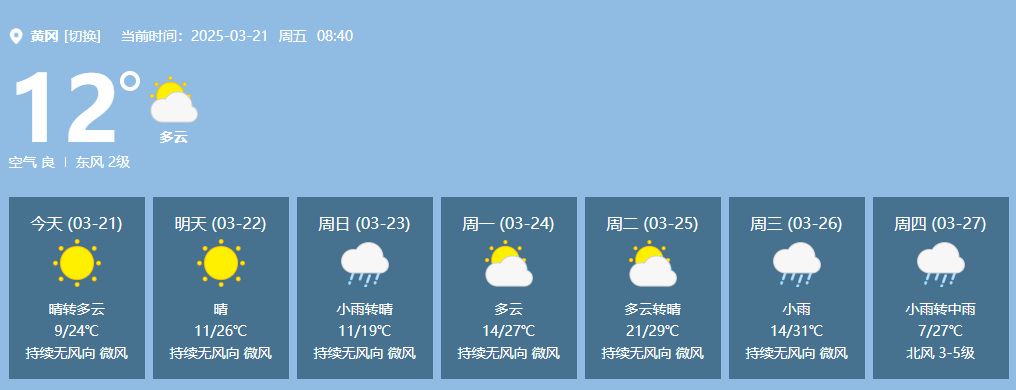 未来七天黄冈天气
