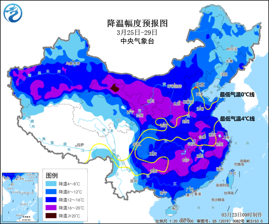 我国大部地区降温剧烈预计3月25日至29日,除青藏高原外,全国大部地区气温先后下降8~12℃,西北地区东部、华北西部、黄淮南部、江淮、江南等地降温幅度可达14~16℃,局部地区日最高气温降幅超过20℃。