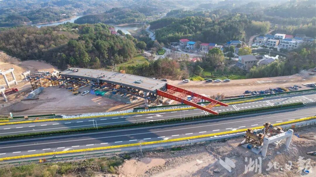 3月23日,燕矶长江大桥完成首个跨高速钢梁曲线顶推。此次顶推的位置位于沙窝枢纽互通A匝道桥处,由武鄂高速南岸往北岸方向进行顶推,距离为80米,总重量达1214.3吨。