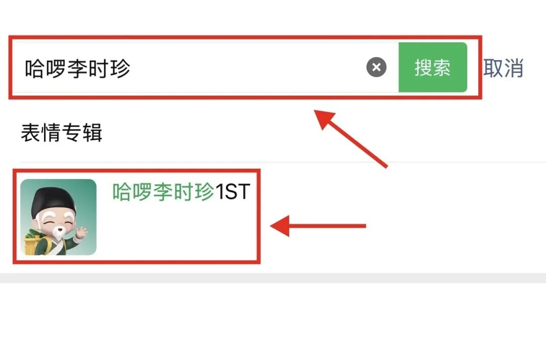 步骤3:在搜索框中输入“哈啰李时珍”进行搜索,并点击“表情专辑”进入下载页面;