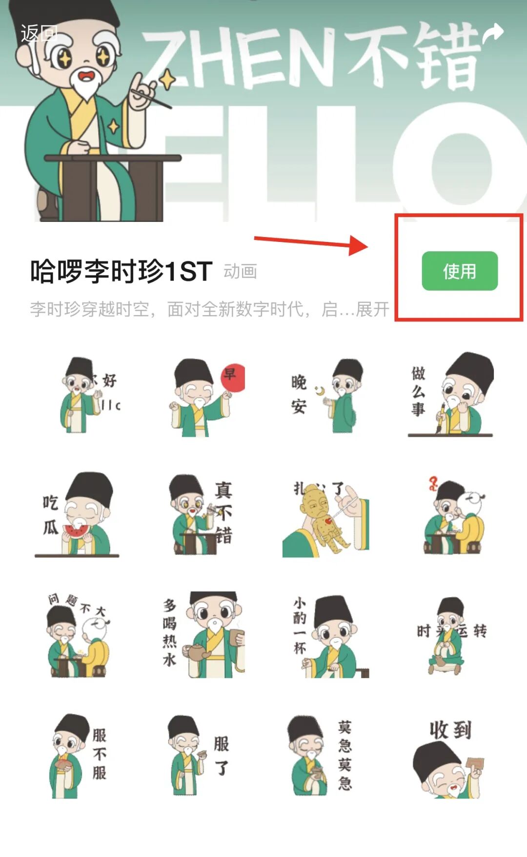 步骤4:在下载页面点击“使用”按钮,这样就能轻松获得表情包啦。