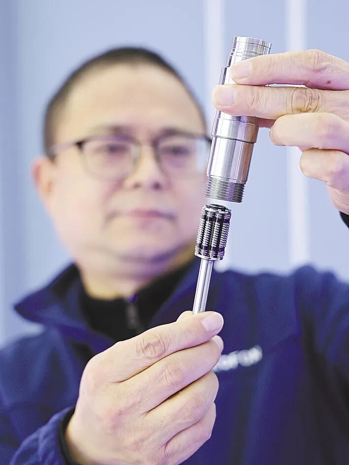 丝杠项目技术负责人周志勇展示科峰智能公司生产的行星滚柱丝杠。(湖北日报全媒记者 刘毅 摄)