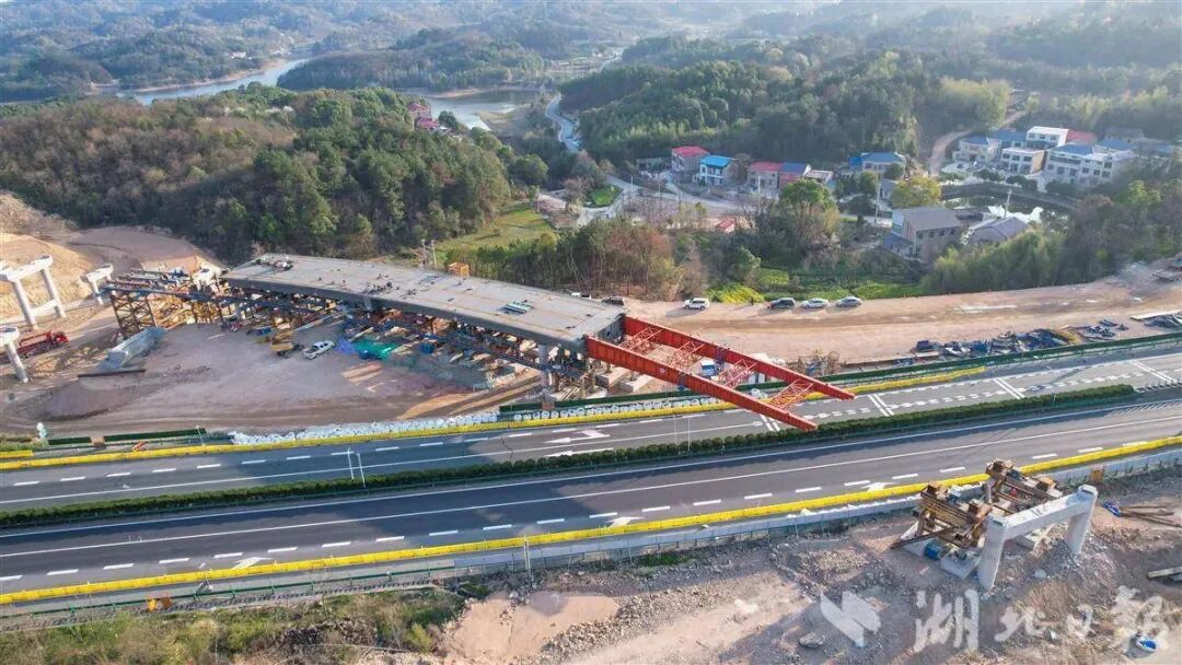 近日,燕矶长江大桥完成首个跨高速钢梁曲线顶推。此次顶推的位置位于沙窝枢纽互通A匝道桥处,由武鄂高速南岸往北岸方向进行顶推,距离为80米,总重量达1214.3吨。
