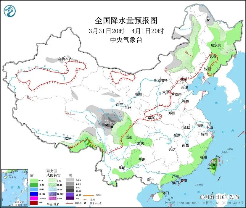 中央气象台预计,3月31日20时至4月1日20时,黑龙江中部和东北部、吉林中东部、辽宁东部、西藏东南部、四川盆地中部、重庆南部、贵州西部、云南东部、华南中南部、浙江南部、海南岛以及台湾岛等地部分地区有小雨,其中,西藏东南部、台湾岛中北部等地部分地区有中到大雨。