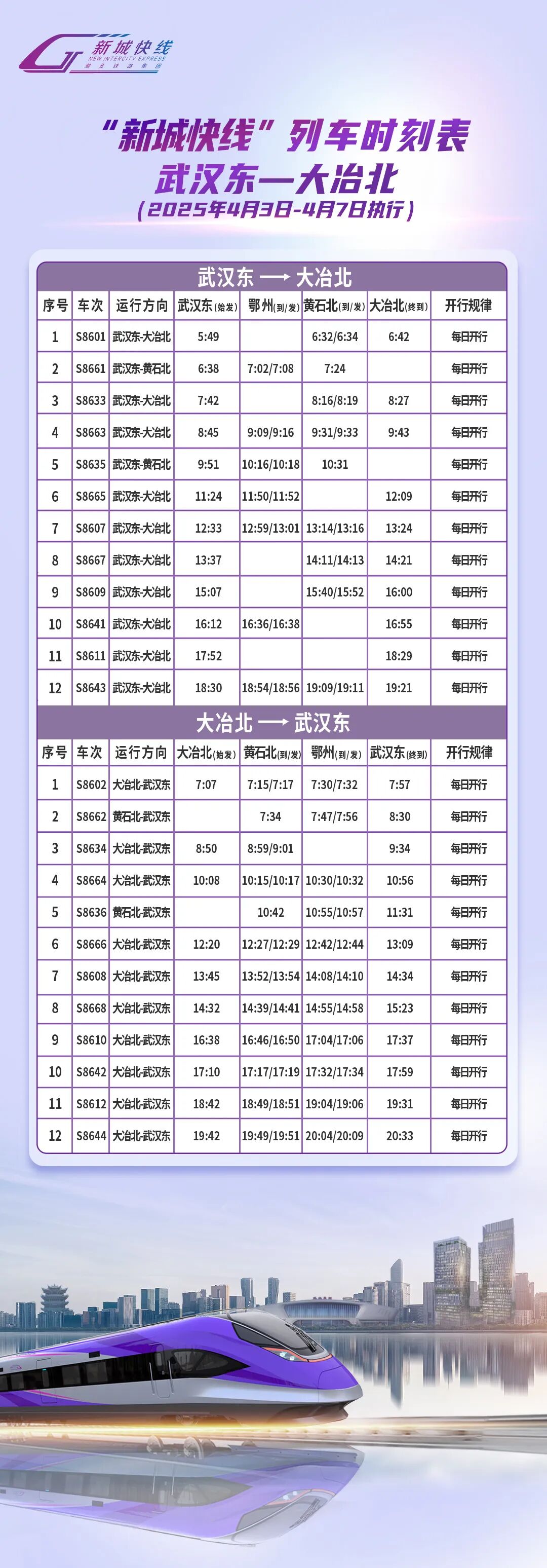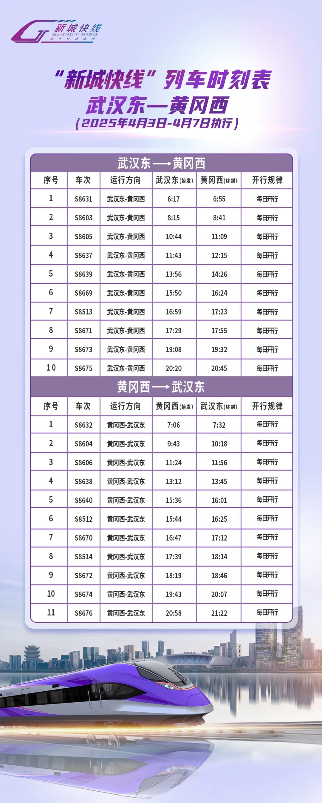 2025年清明节假期运输期限为4月3日至7日共计5天,“新城快线”列车将按45列/日开行。列车开行时刻表如下: