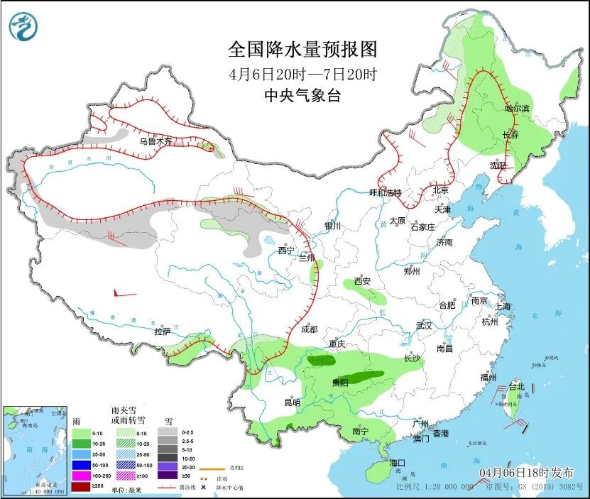 中央气象台预计,6日20时至7日20时,内蒙古东部、黑龙江西部、吉林、辽宁北部、新疆南疆盆地和南疆西部山区、西藏北部、青海北部、甘肃河西等地部分地区有小到中雪或雨夹雪。四川盆地东南部、西南地区东部和南部、华南南部和西部、台湾岛大部等地部分地区有小雨,其中,四川盆地东南部、贵州中南部等地部分地区有中雨,局地大雨。