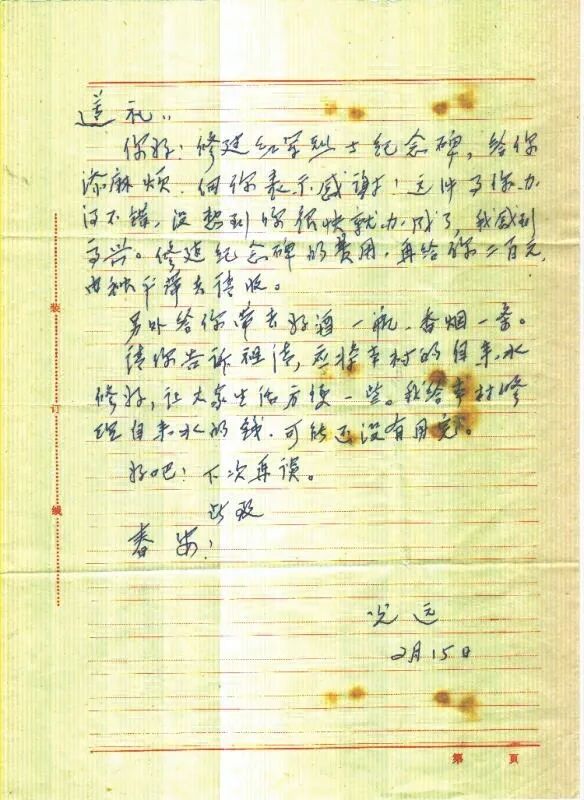 在秦光远将军1995年2月15日写给弟弟秦遵礼的一封家书中,有这样一段文字:“请你告诉祖清,应将本村的自来水修好,让大家生活方便一些。我给本村修理自来水的钱,可能还没有用完。”