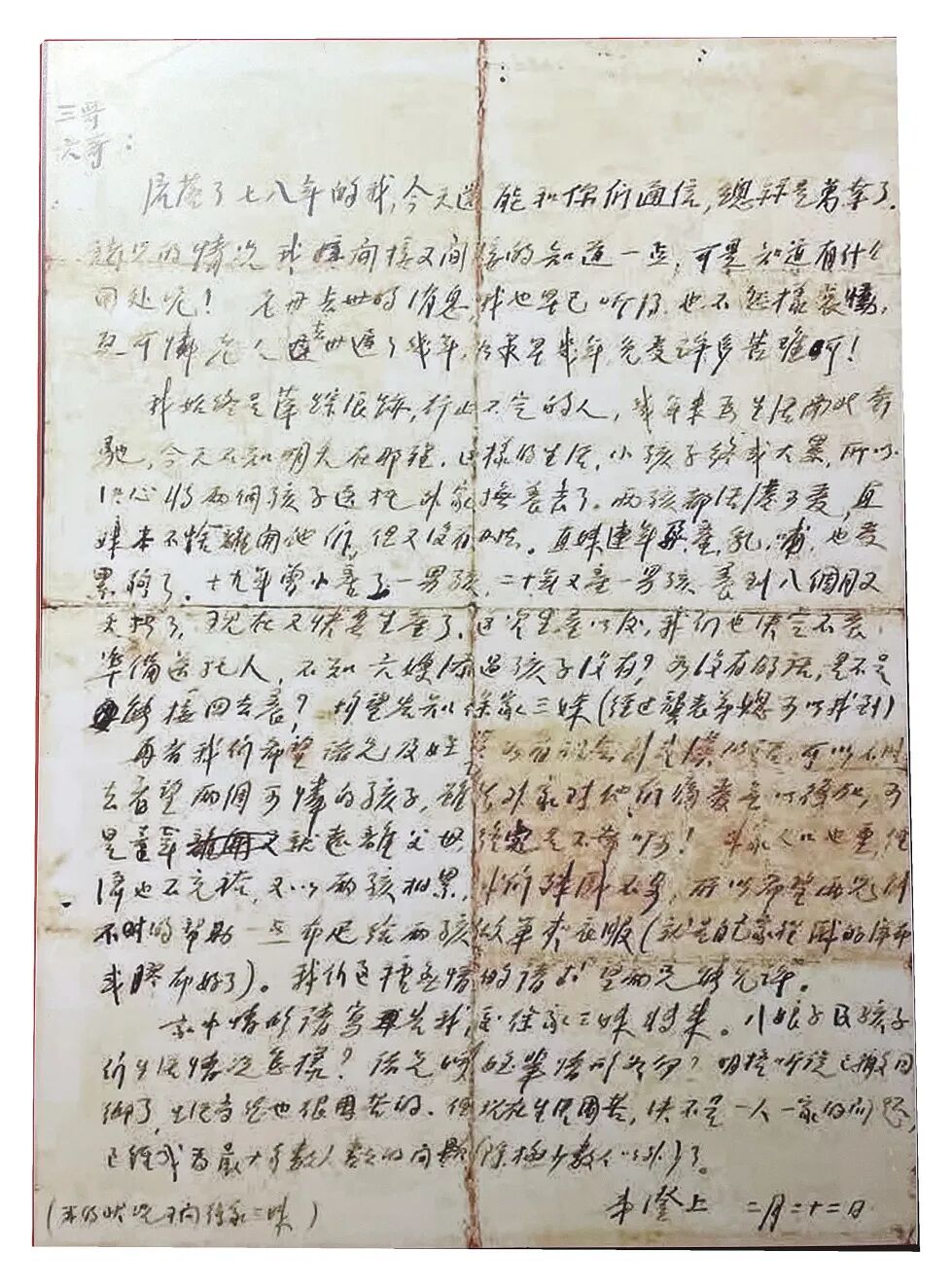 信中字句浸透无奈:“我始终是萍踪浪迹、行止不定的人,几年来为生活南北奔驰,今天不知明天在哪里,这样的生活,小孩子终成大累,所以决心将两个孩子送托外家抚养去了……不知六嫂添过孩子没有?如没有的话,是不是能接回去养?”